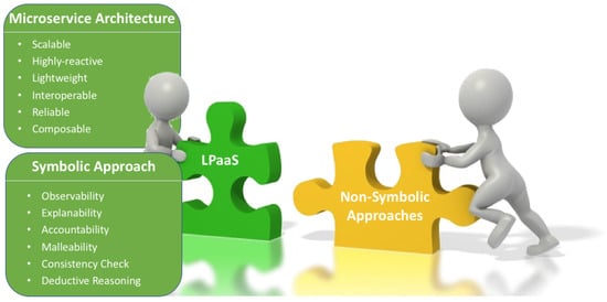 Moreover, the logic-based approach brings advantages related to symbolic reasoning, such as provable properties, sound and explainable inference, and the fact that the intelligent behaviour exhibited by the system becomes explainable—converse to what happens with the majority of non-symbolic approaches. As a step further, references [67,68] show the importance of combining symbolic and non-symbolic techniques to achieve intelligent behaviours. Hybrid intelligent architectures [69] synergically combine the strengths of diverse computational intelligence paradigms and exploit both the domain knowledge and the training data to solve difficult learning tasks. To this end, LPaaS, thanks to its light-weight architecture, could be easily combined with other techniques in order to achieve hybrid reasoning—where symbolic and non-symbolic techniques fruitfully combine to produce intelligent behaviour.