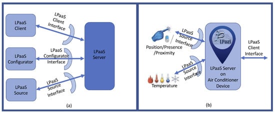 The LPaaS actors and their interfaces (a). An example of the use of the source interface (b).