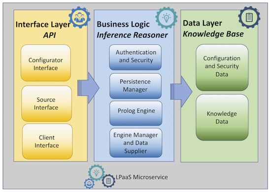 As discussed in reference [47], the LPaaS microservice architecture is composed of three logical units (depicted in Figure 3): the interface layer, the business logic layer, and the data store layer. The interface layer encapsulates the configurator, client, and source interfaces. The business logic wraps the Prolog engine with the purpose of managing incoming requests. The data layer is responsible for managing the knowledge base (KB).