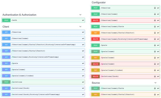 The three interfaces from Section 3.2 are collapsed within a unified RESTful API exposing the same resources to clients possibly playing different roles—namely client, source, or configurator. The two latter roles, since they are capable of applying side-effects to the service KB, require authentication. There are four main REST resource types provided: theories, goals, solutions, and authorisation tokens—as shown in Figure 4, along with their sub-resources and supported operations.