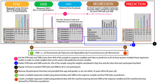 The statistical procedure was modelled on ‘Mining Big Data to Extract Patterns and Predict Real-Life Outcomes’ by Kosinski, Wang, Lakkaraju and Leskovec [2], as well as other research and guidelines in the area of investigation, e.g., [26,52]. Six data sets were utilised that each had specific and not necessarily the same users: a final SWB score, final scores of each FFM trait, Facebook likes of the user, a list of Facebook like ids and their names, demographic (age, gender) data, and location (country).