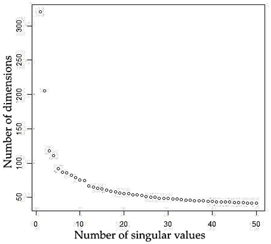 For the prediction of each variable, a user-like matrix was constructed to match users from the SWLS and FFM data sets and likes. The matrix was trimmed, removing users with less than 10 likes and like entities (e.g., “Sleeping Too Much”, “Saying I love you”, “Jason Mraz”, “Bowling”, “Talk With a British Accent Day!”) with less than 50 users. The remaining users were split into 10 folds to reduce overfitting. Fifty SVD dimensions were extracted and underwent Varimax rotation. Figure 2 displays the scree plot for the SVD of the user-like matrix.