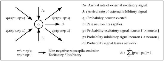 The Intelligent Recommender System is based on the Random Neural Network (RNN) [44,45,46]. The RNN is a spiking recurrent stochastic structure that models more accurately how signals are transmitted in many biological neural structures propagating as impulses or spikes instead of analogue levels (Figure 3). Its mayor mathematical characteristics are the single neural network resolution for steady state and its product form equation. The RNN has been applied in several solutions such as the cognitive packet networks that search and select paths that meet specific Quality of Service metrics [47,48,49,50,51].