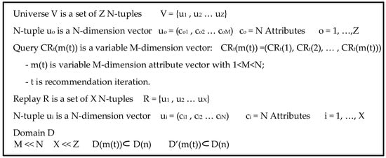 m(t) is variable to enable the addition or removal of attributes according to their relevance during the recommendation process. CRt(m(t)) obtains its parameters from the attributes that form the domain D(m(t)), where D represents the associated domain from which the universe V is created, therefore, D(m(t)) is a set of concepts or properties.