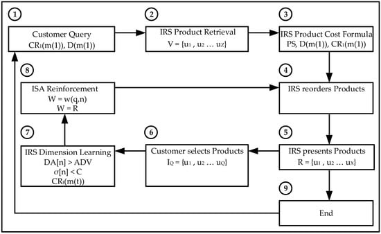The attributes the customer considers related are specified by the customer request CRt(m(t)) as a variable M-dimension vector where the dimension number of the attribute vector m(t) changes as the recommendation iteration t advances. The Intelligent Recommender System chooses products from the universe V assigning a N-tuple ui to every presented product generating a replay set R of X N-tuples. The product cost formula is applied to every product or N-tuple ui from the replay set R of X N-tuples where every ui is considered as a N-dimensional vector. The product cost formula is initially calculated using the related M attributes introduced by the customer on the request, CR1(m(1)) based on the domain D’(m(t)). The final Product Score, PS, is calculated by quantifying the relationship among the figures of the several attributes that it is formed: