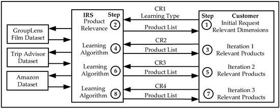 IRS adjusts and acquires the perceived customer’s relevance and rearranges the obtained products based on the related centre point of the product’s dimensions. IRS acquires product relevance on an iterative process where the customer assesses directly the presented products. Its performance is evaluated and compared against the Big Data Recommender Systems (Grouplens film, Trip Advisor and Amazon) with an innovative presented quality metric that combines relevance and rank. This article considers the term iteration as customer recommendation iterations rather than the learning algorithm iterations of the machine learning methods. Two different and independent learning algorithms are included, either Gradient Descent learns the related dimension centre or Reinforcement Learning updates the network weights recompensing related attributes while penalizing irrelevant ones. The research has compared IRS against the Big Data Recommender Systems with customer queries provided directly by validators. In addition, Gradient Descent and Reinforcement Learning algorithms have been independently analysed based on learning rate and product relevance.