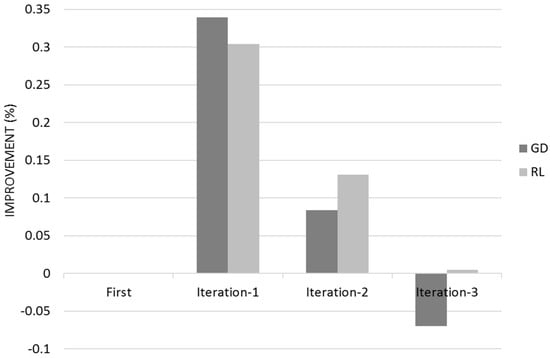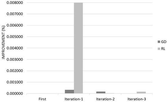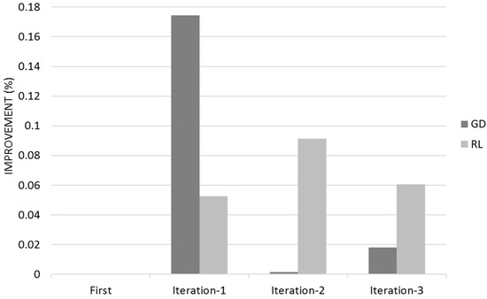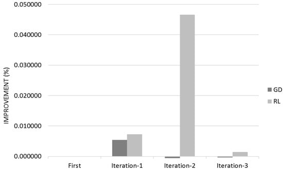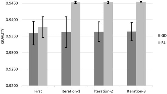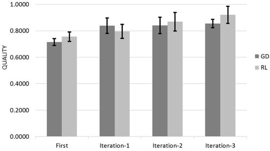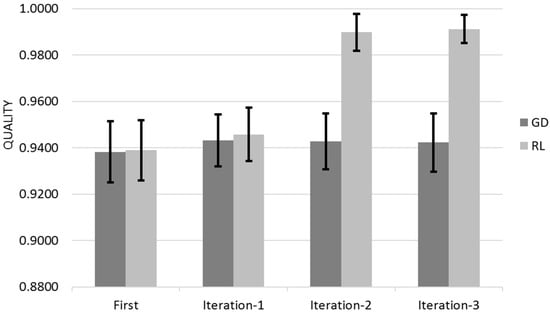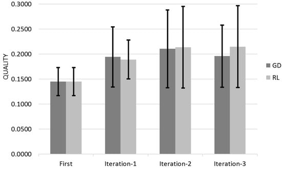 Figure 14 shows the Quality for across the three different iterations for Gradient Descent (GL) and Reinforcement Learning (RL) Algorithms with the 95% Confidence Interval that corresponds to Q ± 95%CR.