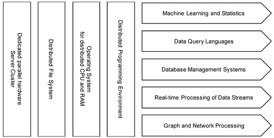 Technologically, the NIST standard defines the big data paradigm as “the distribution of data systems across horizontally coupled, independent resources to achieve the scalability needed for the efficient processing of extensive datasets.” However, this paradigm of parallel processing is also important for the processing of real time data streams. For storage, processing, and analysis of big data, this kind of distributed storage and processing environment (DSP) architecture has been commonly adopted. The Hadoop ecosystem of software tools, as described by Landset et al. [14], is a well-known systems architecture for big data processing. Singh & Reddy [15] describe two reference architectures for big data analytics: the Hadoop Stack and the Berkeley Data Analysis Stack. Both are based on parallel computing using clusters of commodity hardware. For parallel programming, the former is based on Hadoop MapReduce, whereas the latter is based on Apache Spark, which can compute faster because of in-memory processing [16]. Yet, both stacks show similar components that are generalized and summarized in Figure 1. The computing power to tackle large datasets is based on parallelization with dedicated parallel hardware clusters. Using distributed file systems and cluster operating systems, cluster resources such as storage, memory, and processors can be managed centrally. To distribute processing on different machines, both stacks use distributed programming mechanisms. With these components, applications such as machine learning and statistics, data querying, database systems, data stream processing, and graph analysis can be performed even on very large datasets and on massive streams of real time data.