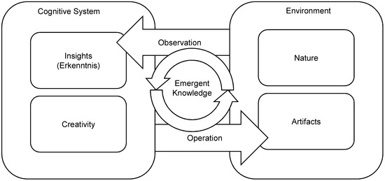 Knowledge emerges by closed loops of observation and operation. This concept can be summarized as knowing through making [26]. If we take this basic feedback loop into account, we can construct a theory of emergent knowledge as illustrated in Figure 2. The proposed model will build upon and deepen the theory of Niklas Luhman [27], who presented a radically constructivist epistemology: a priori, all is one; only observation constructs distinctions. To begin with, observation creates a contrast between subject and object, between the observer and the environment; Luhmann calls the observer “erkennendes System,” which is roughly translated into English as cognitive system.