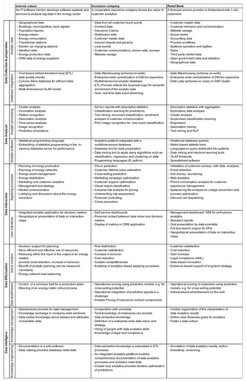 The main hypothesis of this study is that big data management is a cognitive system, and thus, key factors for success in big data management are effectuation and intelligence, two aspects that comprise the main contribution of the proposed model that are neglected by existing models. By observing three cases of big data management in practice, evidence has been provided that this is the case in industrial applications. Firstly, it is evident in the case descriptions that all of the broad categories hypothesized in the model are instantiated in practice. All of the three cases provided many instances for all the fields of action in the framework, as can be seen in Figure 6. This is a qualitative indicator that the model corresponds well to reality. Secondly, there is an evident heterogeneity in solutions for each of the fields of actions. There is a variety of solutions that can all be purposeful depending on the context. Thirdly, we can see in the fourth and fifth column of Figure 6 that, as was hypothesized in the model, both data effectuation in the form of value creation and feedforward control and data intelligence in the form of knowledge management and knowledge engineering, are an important aspect of big data management in practice for all three observed cases. Fourthly, the described cases in Figure 6 provide practical examples for how to effectuate big data analytics and how to support big data management with knowledge-based methods.