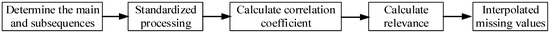 Considering case 2 and case 3, this paper uses the gray correlation degree to interpolate the data. The SF6 gas derivative content data complementing method based on gray correlation is to perform gray scale processing on other component data except the missing value attribute, and to find the closest set of data with the missing value tuple by calculating the correlation degree to make up the complement treatment. The main process is shown in Figure 4.