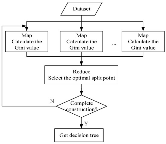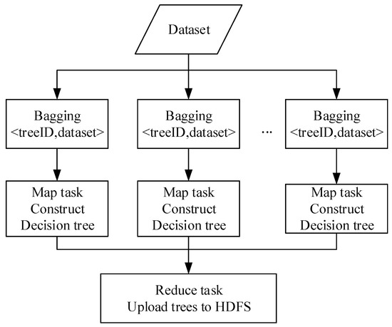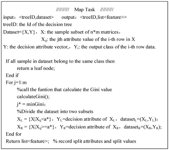 Using the MapReduce framework to achieve the parallelization of the random forest algorithm mainly has two stages: Map and Reduce. Each Map task establishes a decision tree, and finally uploads them to HDFS in the Reduce task to form a forest. The parallel forest construction process of random forest is shown in Figure 5 and the specific tree construction process of Map task is shown in Figure 6.