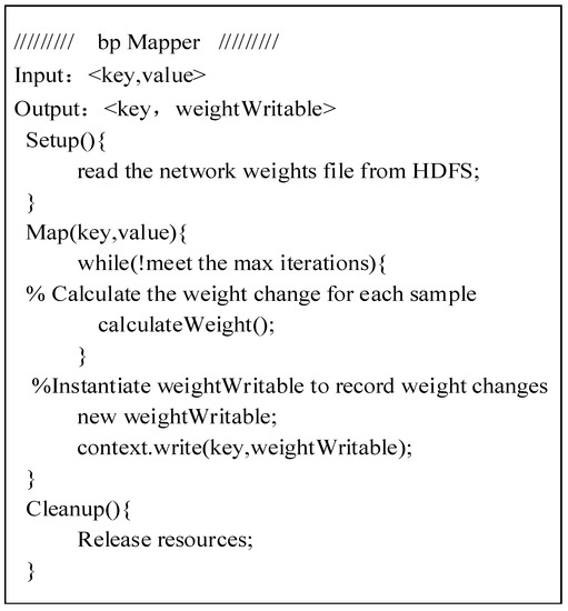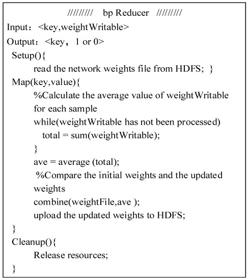 In the Reduce stage, the <key, weightWritable> output of the Combine stage is used as the input of Reduce stage. The Reduce () function is to calculate the average value of the value for each key, and compare it with the network weight stored on the HDFS to determine whether to perform the next loop operation, and finally re-write the updated weights to HDFS. The pseudo code of Reduce stage is shown in Figure 11.