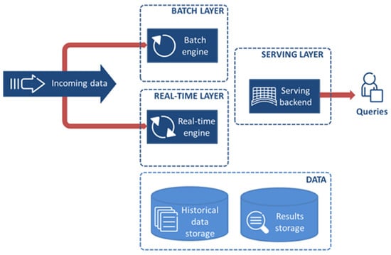 On the other hand, several optimal and novel applications have been done in applying Lambda architecture [,]. For example, Kiran et al. [] presented a cost-optimized lambda architecture that combines online and batch data processing to handling a huge volume of sensor data. Both procedures can produce effective data accumulations, combinations or aggregations that are easier to analyze for identifying hidden patterns. It is also a promising method that reduces significantly the processing time and the resource requirements. Moreover, Yamato et al. [] used a lambda architecture to analyze data from IoT sensors. It is a data analytics framework that uses incremental learning techniques to identify anomalies in real time.