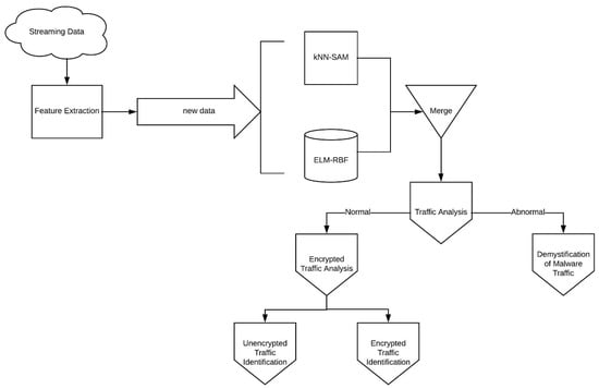 A basic innovation of this methodology is the combination for the first time in a hybrid machine learning framework the ELM/GRBFK and SAM/k-NN algorithms. The combination offers high learning speed, ease of execution, minimal human involvement and minimum computational power and resources for network traffic analysis, demystification of malware traffic and encrypted traffic identification.