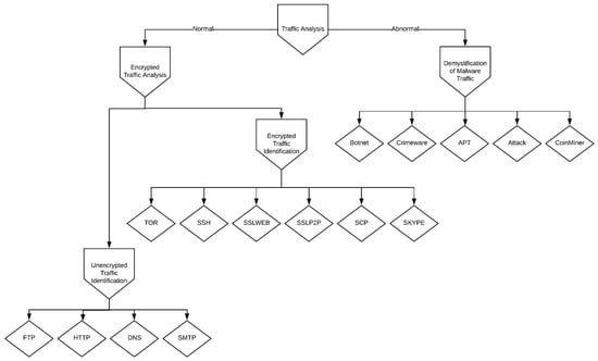 The first investigation is whether the traffic is normal or abnormal (network traffic analysis). If the traffic is abnormal, it will be further analyzed (malware traffic demystification) for the purpose of identifying the specific abnormality (botnet, crimeware, Advanced Persistent Threat (APT) attack, CoinMiner, etc.). Besides, if the traffic is normal, it will be further analyzed to inspect whether the application or protocol uses non-encrypted traffic ( File Transfer Protocol (FTP), Hypertext Transfer Protocol (HTTP), Domain Name System (DNS), Simple Mail Transfer Protocol (SMTP), etc.) or encrypted traffic (encrypted traffic identification), as well as which protocol that it uses (The onion router (Tor), Secure Shell (SSH), Secure Sockets Layer Web (SSLweb), Secure Sockets Layer Peer-to-Peer (SSLP2P), Secure Copy Protocol (SCP), Skype, etc.).