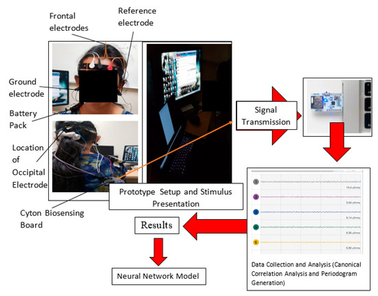 The setup consisted of five electrodes (four frontal and one occipital), positioned on a headband that the subject wore. The stimuli were presented on a laptop. Data was collected from the Cyton Biosensing Board, which received the signals from the electrodes placed on the subject’s scalp in the EEG headband and wirelessly transmitted them to a USB dongle placed in a laptop computer.