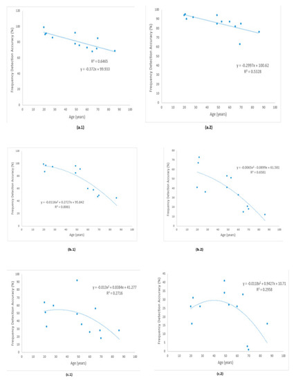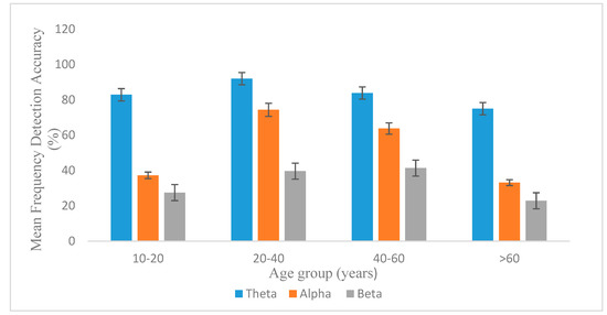Figure 2 demonstrates an inversely proportional relationship between age (20 and above) and detection accuracy of theta, alpha, and beta stimulus frequencies in the SSVEP signal. However, while the relationship between theta frequency detection accuracy and age seems to be linear, as shown in