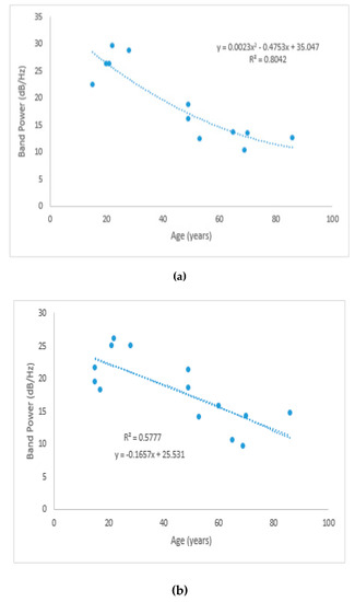Table 2. SSVEP band power displays an overall decrease as a function of age, in EEG responses to all three frequency bands. As in the case of frequency detection accuracy, its relationship with age can be delineated using quadratic regression, and it peaks at age group 20–40.