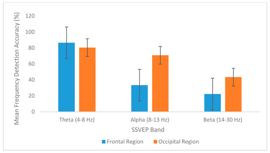 Figure 5, was established by the results, in which the mean detection accuracy of theta stimulus frequencies was detected with higher accuracy in frontal SSVEPs than in occipital SSVEPs, while alpha and beta frequencies were detected with higher accuracy in occipital SSVEPs. Furthermore, detection accuracies in occipital SSVEPs have lower variation levels, as demonstrated by fairly shorter error bars. This suggests that detection accuracy of stimulus frequencies in SSVEPs elicited in the occipital region have greater reliability. These trends can be attributed to the origin of theta and alpha SSVEP signals: While the primary source of theta waves is the frontal midline, alpha waves predominate in the occipital cortex. Thus, one can infer that the detection accuracy of frequencies pertaining to particular bands, found in specific regions in the human brain, depends on the location of the SSVEP being analyzed.