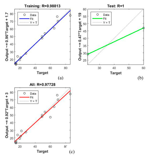 Figure 6c, the correlation coefficient between the network outputs and the target outputs is relatively high, showing that the model fits the data well.