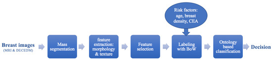An overview of the proposed breast cancer CAD system is illustrated in Figure 1. After the segmentation step, a set of morphological features are extracted to characterize the detected lesion. A feature selection process is then applied to discard irrelevant features extracted from MRI and DECEDM. Generally, knowledge-based systems (KBS) are used to solve complex problems which deal with a big amount of data. Unlike conventional computer programs, KBS represent high level knowledge explicitly using tools such as ontology. The new generations of KBS use a combination of structured representation of domain knowledge and reasoning tools of a particular domain. The semantic gap existing between low level image based features and clinical data on the one hand and expert concepts handled in analysis and diagnosis on the other hand needs to be filled by semantic annotation or labeling [16]. The modeled features are a subject to a data fusion with kinetic feature and risk factors in order to build a BoW. Different concepts defining our BoW are used including texture, shape, breast density, breast MRI and DECEDM contrast enhancement and patient age. In a further step, the modeled (BoWs) are used to classify the lesion severity as benign or malignant.