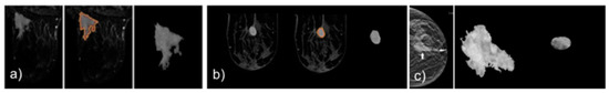 Lesion segmentation and extraction. (a) malignant lesion from breast MRI. (b) benign lesion from breast MRI. (c) malignant lesion from dual energy contrast enhancement mammography (DECEDM).