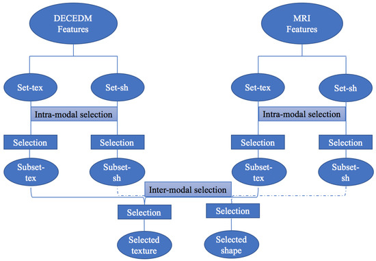 Generally, feature selection methods are built independently. Their combination may lead to positive correlations since they aim to achieve the same goal and are based on the same learning data [39,40,41,42]. Several selection techniques can be used to keep only pertinent features and make decision more efficient [43,44,45,46]. Bagging, random subspace, random forest, adaBoost, and rotation forest methods have been applied for different applications [41,47,48,49] such as health-care and especially for breast cancer diagnosis [39,50,51,52,53,54]. Nonetheless, such approaches have some limits due to eventual correlation between descriptors. Besides, they often require a consistent amount of learning data to be efficient. Small databases could present an inherent risk of imprecision and under-fitting which presents a great challenge for many recognition systems. Here, we are in front of two main challenges: dealing with features extracted from two different modalities and dealing with a small sample set case. In such cases, researchers require the use of fuzzy integral since they are able to classify patterns in a non-dichotomous way and to handle vague information. Many fuzzy integral-based aggregation processes exist in the literature, and they can be divided into additive integrals such as simple weighted average (SWA) [55], quasi arithmetic means (QAM), ordered weighted average (OWA) [17,56], weighted min and weighted max, etc, and non-additive integrals such as Sugeno integral, Choquet integral, etc. Unfortunately, additive operators presume that attributes are always independent to each other. This assumption is inapt with real scenario where the features hold interactive characteristics [57]. Therefore, aggregation should not be always carried out using additive operators. According to Michel Grabisch [58], the OWA operator is a particular case of Choquet integral. Sugeno and Choquet integral operator could be used to deal with these interactive features. Although both integrals are able to capture the usual interactions existing between the features, the application of Choquet integral is widening across many disciplines with greater extent than the Sugeno integral. Firstly, according to Iourinski and Modave [59], Choquet integral is better suited for numerical or quantitative based problems, whereas, the Sugeno integral is more ideal for qualitative problems. In fact, the application of Choquet integral can generate more practical outcomes as most of the multiple feature problems involve numbers which have a real meaning (interval or ratio level of measurement) where cardinal aggregation is intended, unlike Sugeno integral which is more suitable for ordinal aggregation where only the order of the elements is important. Secondly, Choquet integral has the merit in producing unique solution in contrast to Sugeno integral [57]. According to a comparison study between Choquet and Sugeno integrals as aggregation operators for pattern recognition, done by Martinez and al. [60], the Choquet integral gives better results than the Sugeno integral using and without using the cross validation method. Accordingly, we based on the Choquet integral for breast cancer feature selection with a cross validation method. Inspired by expert’s reasoning, the proposed selection process scheme is dressed in Figure 3. As illustrated, a two level selection process is applied: an intra-modal selection where feature selection process concerns the different modalities involved in the analysis and an inter-modal selection where most relevant features extracted from one modality are selected. At the intra-modal selection level, each modality is treated separately. The selection process is applied on the whole set of texture and shape features denoted by Set-Tex and Set-Sh respectively. As result, the selected features constitute two subsets Subset-Tex and Subset-Sh of selected features. Then, an inter-modal selection is applied. The selected features are combined and the selection process is restarted. Finally, we get two subsets of selected features; selected texture features and selected shape ones.