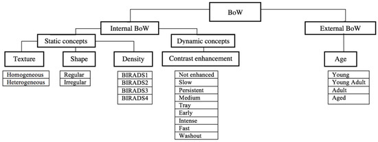 Here, we derive the different concepts which define our BoW. Figure 4 illustrates these concepts. They could be divided into internal image derived BoWs such as static knowledge (shape, texture, breast density) and dynamic knowledge (breast MRI and DECEDM contrast enhancement agent CEA), and external BoWs or meta-knowledge such as the age. Known that breast density and contrast enhancement are extracted from patient file, shape and texture features are modeled by labeling the low level extracted features from images. Accordingly, we use here two texture labels to characterize breast masses: heterogeneous and homogeneous, and two shape labels: regular for oval and round shapes or irregular for other ones. Breast density characterizes the breast tissue fatness and homogeneity. Higher breast density induces low contrast in mammography making breast cancer detection harder. According to the breast imaging reporting and data system (BIRADS), semantic of the ACR (American College of Radiology), breast density can be classified into four groups where the risk of missing cancer detection increases from category 1 to category 4. The perception of the CEA in breast MRI and DECEDM can give an idea about the lesion type: no enhancement in DECEDM or slow and persistent in MRI for benign lesion, medium and tray enhancement in MRI for intermediate and intense enhancement in DECEDM or early, fast and washout enhancement in MRI for malignant lesion. Age is modulated by age range (young for age < 25, adult young for 25 ≤ age < 50, adult for 50 ≤ age < 75 and aged for age ≥ 75).