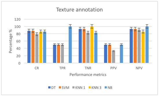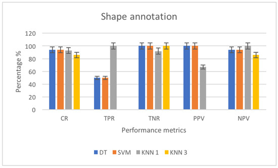 where k is a kernel function. Here we choose, by default, a linear function. If c≤ 0, then x is classified as a member of the first group, otherwise it is classified as a member of the second group. The method used to find the separating hyperplane is sequential minimal optimization (SMO). For the classification step, we used results from the training to classify vectors x according to the same Equation (22). A binary regression decision tree was used when applied DT classifier. Using the KNN method, the euclidean distance is applied and the samples are classified using the nearest method where the majority rule with nearest point tie-break is applied. To train a multi-class naïve bayes model, we use predictors and class labels. The predictor distribution within each class is modeled using a Gaussian distribution.