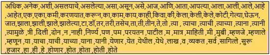 - Removal of Stop words: Stop words are the words which do not contribute to the meaning or to the sentiment orientation of the sentence. For the Marglish dataset the English stop words are only removed and for the Devanagari dataset the Marathi stop words are extracted from [30], stored in the csv file. Figure 3 sentence explains the stop words removal process. Figure 4 and Figure 5 represent the English and the Marathi stopword list.