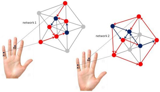 Schematic illustration of self-organizing functional reorganization in a fixed-size neural network in the somatosensory brain before (left) and after (right) unsupervised learning of a visually guided manual robotic precision task [103,104]. Mechanoreceptors on the middle phalanxes of the small (R1) and the middle fingers (R2) are indicated. Two different network representations correspond to brain-behaviour states before (left) and after acquisition of grip force expertise (right) for performing the robotic precision task. The different levels of connectivity used here are arbitrarily chosen, and for illustration only; single nodes in the networks displayed graphically here may correspond to single neurons, or to a subpopulation of neurons with the same functional role. Red nodes may represent motor cortex (M) neurons, blue nodes may represent connecting visual neurons (V). Only one-way propagation is shown here to keep the graphics simple, knowing that the somatosensory brain has multiple two-way propagation pathways with functional feed-back loops [82,83,84,85].
