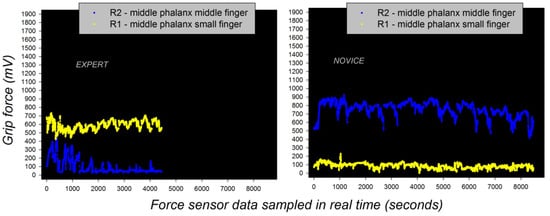 The grip force profiles of a novice (beginner) and a skilled expert in the manipulation of the robotic device directly reflect such differences in somatosensory cortical representation before and after learning. Individual grip force profiles, corresponding to thousands of individual force sensor data, were recorded in real time from different sensor locations, including R1 and R2 (Figure 3) on the middle phalanxes of the small (R1) and the middle fingers (R2) in the hands of a total beginner and the expert across several robotic task sessions. The grip force profiles are shown in Figure 4 here below. They display two radically different functional states with respect to gross (middle finger) and fine (small finger) grip force control, translating motor expertise and functionally reorganized somatosensory network states driven by self-organization.