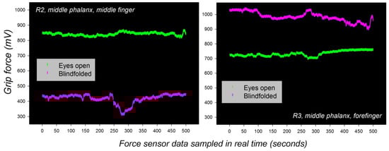 The grip force profiles of one and the same individual adapt spontaneously to new sensory input from other modalities, as predicted by the general functional organization of the somatosensory brain networks [82,83,84,85,86]. Such spontaneous adaptive ability is reflected by dynamic changes that are short-term potentiated, rather than reflective of long-term plasticity. An example of spontaneous grip force adaptation to new visual input in one and the same individual is shown here below in Figure 5. The subject was blindfolded first, then made to see again, during a bimanual grip task where young male adults had to move two weighted handles up and down [105]. The individual grip force profiles corresponding to force sensor recordings from the middle phalanxes of the forefinger and the middle finger in the dominant hand are shown for comparison (Figure 5).