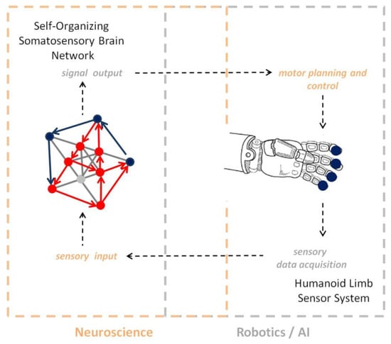 Self-organization is a major functional principle that allows us to understand how the neural networks of the human brain continuously generate new knowledge at all hierarchical levels, from sensory to cognitive representation. From the philosophical standpoint, the principle of self-organization establishes a clear functional link between the “mental” and the “physical” [109,110]. As a fundamental conceptual support for the design of intelligent systems, it provides conceptual as well as mathematical [1,2,3] tools to help achieve system stability and reliability, while minimizing system complexity. It enables specific fields such as robotics to conceive new, adaptive solutions based on self-reinforced systemic learning, where the activity of connections directly determines their performance and, beyond robotics, allows for the conceptual design of a whole variety of adaptive systems that are able to learn and grow independently without the need for adding non-necessary structural complexity. There is a right balance between structural and functional complexity, and this balance conveys functional system plasticity; adaptive learning allows the system to stabilize but, at the same time, remain functionally dynamic and able to learn new data. Activity-dependent functional systemic growth in minimalistic sized network structures is probably the strongest advantage of self-organization; it reduces structural complexity to a minimum and promotes dimensionality reduction [111,112], which is a fundamental quality in the design of “strong” Artificial Intelligence [5]. Bigger neural networks akin to those currently used for deep learning [113] do not necessarily learn better or perform better [114]. Self-organization is the key to designing networks that will learn increasingly larger amounts of data increasingly faster as they learn, consolidate what has been learnt, and generate output that is predictive [47,68] instead of being just accurate. In this respect, the principle of self-organization will help design Artificial Intelligence that is not only reliable, but also meets the principle of scientific parsimony, where complexity is minimized and functionality optimized. For example, a single session of robot controlled proprioceptive training induces connectivity changes in the somatosensory networks associated with residual motor and sensory function [115], translating into improved motor function in stroke patients. This example perfectly illustrates the closed-loop epistemological link (Figure 6) between systems neuroscience and robotics/AI. Robotic sensory learning models inspired by self-organizing somatosensory network dynamics (in short: AI) are currently developed [115,116,117], within and well beyond the context of motor rehabilitation programs. Further studies on the effects of repeated training sessions on neural network learning and somatosensory functional plasticity will 1) enable the possible generalization of motor relearning and treatment effects in the clinical domain and 2) the development of reliable robot motor learning and control on the basis of “strong” neuro-inspired AI.