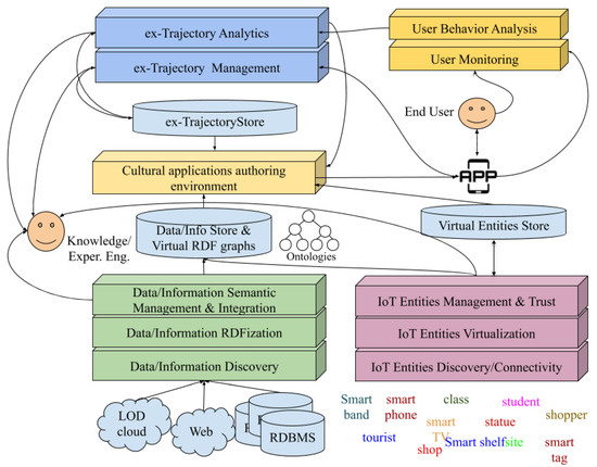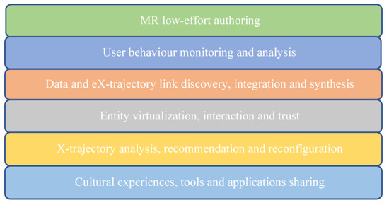 Insofar, however, each cultural application is designed, implemented, and deployed separately, increasing the associated development costs (content development, code creation and testing, infrastructure deployment, and maintenance), while, at the same time, limiting the opportunities for sharing and reusing cultural experiences to the level of recommending isolated points of interests (PoIs) or coarse-grained routes [7,8,9]. The impact of these challenges is more pronounced in augmented, virtual, and mixed reality (AR/VR/MR) systems, for which content development, code implementation and deployment infrastructure are more complex and demanding. In addition, the range of the required hardware and software systems [10] poses further data integration and reuse issues.