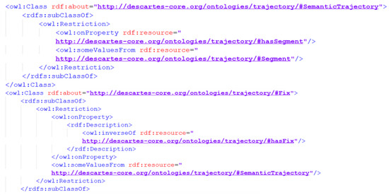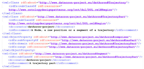 In the heart of SemMR, there is a triple store for storing and querying integrated data in Resource Description Framework (RDF) data model [55] and the SemMR ontology encoded in the OWL W3C ontology language [56]. The SemMR ontology is designed to encompass representations for eX-trajectories, VEs, and all additional domain-specific data and information that is required, i.e.,