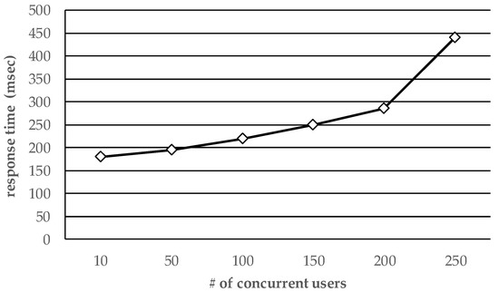 The eX-trajectories that were generated by the system were parsed and evaluated for appropriateness to each user profile and visitor path. They were found to be in alignment with the user’s visiting style, thematic preferences, and associated stereotype. For approximately 70% of the user/path combinations, 1–3 of the suggestions contained exhibits beyond the user profile thematic preferences, thus fostering novelty and serendipity [65]. As far as performance is concerned, Figure 9 indicates the overhead of formulating the eX-trajectory recommendations under varying degrees of concurrency.