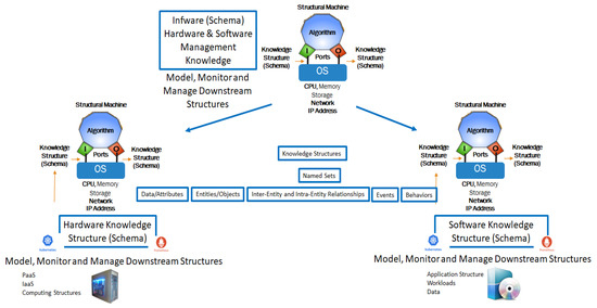 The schema in Figure 9 describes the hardware components, software components, and their management characteristics defined by knowledge structures, forming an autopoietic automaton. The knowledge structures represent this schema in the form of a system of named sets containing various data elements, objects, or entities that are composed of the data, and their inter-object and intra-object relationships and behaviors associated with events that cause changes to the instances as time progresses [27].