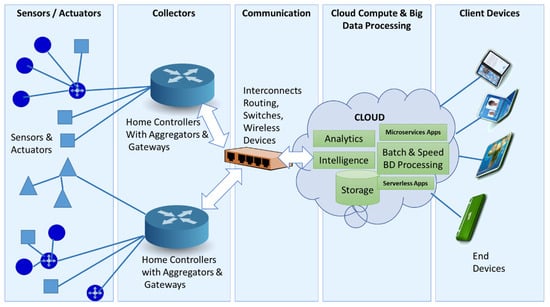 Generic IoT architecture with cloud and big data processing extensions.