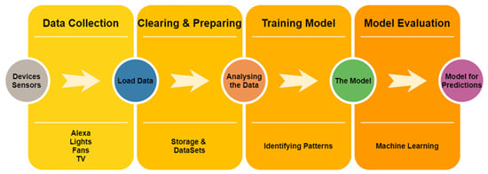 Research in home appliance technologies over the past two decades were more focused on developing new electrical gadgets to achieve efficiency through smart use of electricity [,]. Studies have reported the technological advancements in the smart home arena coming from three generations based on electromagnetic contacts, temperature sensors, smart power accessories, passive RFID and infrared based sensors. Some of these sensors provide very little data, and further, low-cost devices are prone to data noise and computational limitations. While wearable devices such as personal health tracking gadgets can provide more accurate and rich data, they are intrusive and need to be charged and always operational []. With the recent advancement in the IoT landscape, various web-based applications could be used to distribute and process information via the Internet and the wireless home network connected to different home appliances and sensors. Recently, the term ‘smart home’ has been more interchangeably used with ‘home automation’ with an aim to enhance quality of life and personal wellbeing using automatic voice detection [,,]. Some home automation systems have been developed with specific objectives such as improving energy-efficiency, safety and home protection from intruders. There is a need for load balancing of energy to allow several devices to be operational simultaneously and to be controlled by different users in the home with an easy-to-use interface that can even cater to multiple home occupants’ preferences []. While vision-based technologies making use of artificial intelligence are sophisticated, they are perceived intrusive and their automation models cannot be generalised or integrated with other technologies []. Further, environmental conditions such as light, heat and other changing conditions that affect the model could be quite challenging to be incorporated in a smart home automation system. User-friendly smart phones are also being employed for personalisation and automation control [,]. However, for future sustainable smart home automation, we need to make use of the hidden potential of big data captured in the smart home ecosystem. Artificial intelligence techniques such as machine learning for big data analysis and decision making could be employed in a non-intrusive manner to achieve a personalised smart home automation [,,].