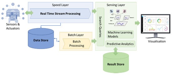 The data are generated by home devices and sensors by our proposed home automation hub and can be stored into several databases and data stores. The required querying capability is achieved by data warehousing features that are available in cloud software such as Apache Spark QL, Apache Hive or Cloudera Impala. Figure 3 provides a high level physical big data IoT architecture [,,]. The data analysis and intelligent computations are carried out using distributed cluster computing frameworks such as Apache Sparks. Further, ML algorithms are employed for human behaviour pattern recognition. The result of such intelligent data processing and personalisation can then be archived in the result store and utilised by home devices to carry out automated actions as well as data visualisation. Also, as new data are continuously added via the data stream that gets collected daily, the model makes use of the speed layer and batch layer of big data technologies for data processing. Finally, the output will be used for reinforcement learning in the servicing layer of the big data architecture that caters to both functional and non-functional requirements [].