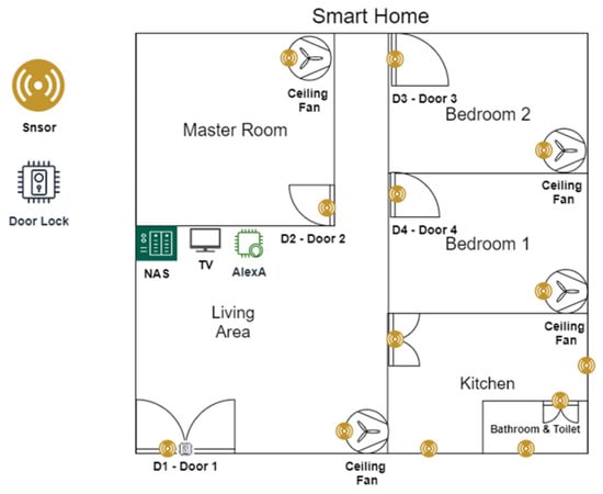 We developed our research prototype as a use case to study the feasibility of the proposed big data processing backed IoT architecture using OpenHab integrator and other smart home devices. Figure 4 shows the physical layout of our smart home research prototype comprising of a living area, a master room, a kitchen, two bedrooms, and a bathroom along with IoT deployment. The proposed architecture supports developing complex cooperative applications that connect, process, store and analyse data received from the edge environment using IoT, cloud and big data technologies []. We implemented new applications on scalable platforms containing fully managed services along with ML and big data analytics capabilities for the development of the smart home research prototype.