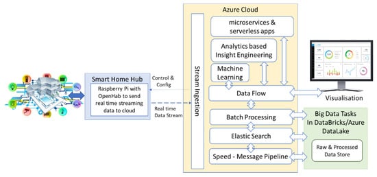 A smart home aims at enhancing the quality of human life covering different domain areas of application such as personal, social, medical, environmental, logistics and energy. With our generic implementation platform, our use case can be extended to cater to different smart devices that include smart plugs and outlets, motion sensors, smart window shades, smart robot-vacuum cleaners, smart cooking appliances, smart doors, home security devices, irrigation system, entertainment devices, heating/cooling devices and fans. Smart devices use various smart networking protocols such as Z-wave, ZigBee, BlueTooth, Insteon, Wi-Fi or older X10. They connect to smart home hub for further inclusive collaboration. This smart hub will connect with multiple compatible smart devices via the home Wi-Fi network; it also connects using Nifi real time streaming service. This real time streaming data are then ingested at the Azure cloud for further processing using DataBricks data lake and spark processing tech stack. Figure 6 shows the key software used in the use case, namely, OpenHab, Azure Cloud Services, Databricks DataLake and Apache Spark Big Data Processing Framework.