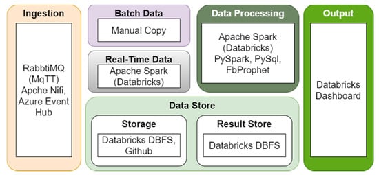 A significant value of the IoT deployment is in the interpretation of data and the decisions derived through its analytics. Figure 7 shows the various components of the analytics adopted for implementing the smart home research prototype. The data ingestion component is required for the data to be staged for both stream and batch processing using an event messaging framework. Subsequently, after data gets interpreted and analysed in real time as a streaming dataflow, it is stored in a data lake and retrieved for analytics in the cloud. A stream processing component is required to cater to any continuous stream of data from various devices in real-time, which is possible with in-memory data processing. Batch processing, on the other hand, is efficient in dealing with high-volume data. It is particularly useful when IoT data needs to correlate against historical data. Depending on the use case, our approach allows scalability when the data needs to be correlated with other sources dynamically. In many simple use cases, the data gets logged and dumped to a data lake like Databricks DBFS as the storage component. Subsequently, the prediction and response from data is rendered as outputs where information may be presented in a visual form of a dashboard such as the Databricks dashboard. The system’s response can also be sent back to the edge smart devices using the smart hub, where corrective actions can be applied to resolve issues if any.