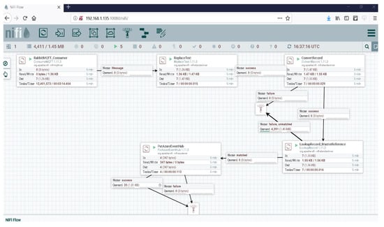 The IoT stream from a sensor to a cloud is assumed to be constantly inputted asynchronously from various devices and are structured or unstructured messages that are processed in real time. Different device controllers emit a combination of structured and unstructured real time stream data continuously that are collected and transmitted by the smart hub into cloud services. For this purpose, we configured Rabbit MQ as a MQTT broker and executed it as a docker container inside the Raspberry Pi. However, transmission to the cloud ingestion component requires a scalable data routing, transformation, and system mediation logic. Thus, the Apache NiFi service (shown in Figure 8) was configured to collect all sensor data via MQTT and transmitted as encrypted content via SSL and HTTPS protocols.
