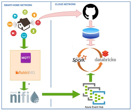 The data pipeline processing codes were retrieved from GitHub code repository as stored notebooks. The interactions of smart home and Azure Cloud along with Databricks Delta Lake are shown in Figure 9. The Apache Spark framework was employed to process big data stored on Databricks DBFS, and the cluster setup included services such as memory pool, scheduler, cluster manager, job tracker, DAG tracer, memory and workload monitoring. Databricks Runtime ML was implemented and updated with every Databricks Runtime release.