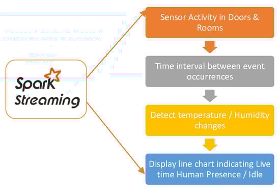 Spark Streaming is a distributed data stream framework for processing live data streams in real time. Spark stream frames enabled the processing of high-velocity data stream by allowing a combination of current data streams with historical data stream for pattern recognition. Frames derived from past data analysis for detecting any human activities were executed for pattern matching against a live data stream to determine any real time human activity in the entire home. Similarly, activity detection in the entire home in real time, such as detecting human presence in a room or a space was achieved using queries on live stream event patterns. A sample streaming comparison table on the temperature parameter with our prototype deployment is shown in Table 5.