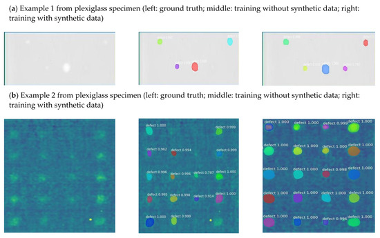 As shown in Figure 8 below, the segmentation results of five examples Figure 8a–e from the Mask-RCNN model are indicated. The segmented results in the middle column were the validated results from the model trained on raw images after preprocessing (Database A, C). The segmented results in the right column were the validated results from the model trained on raw images merged with synthetic images after preprocessing (Database B, D). Meanwhile, in the first three rows, the results from plexiglass specimens (Validation Database E) are shown. The last two rows show the results for CFRP specimens (Validation Database F). The segmented defects from obtained images clearly show the improvement when trained on raw images merged with synthetic images after preprocessing in Figure 8. Although each segmented region has different color, all the colorful regions in the images represent true positive detective cases.