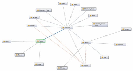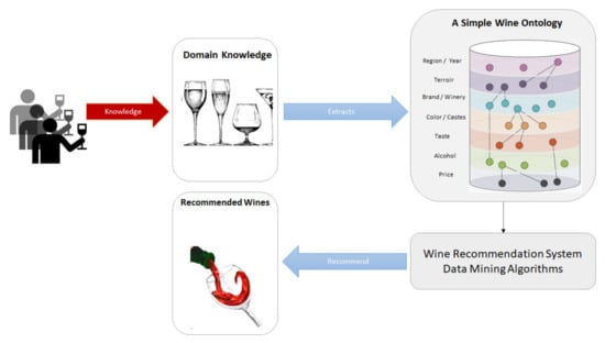 With such a variety in types, uses and applications, and with its popularization due to the World Wide Web, the wine market is being slowly shifted to an e-commerce business model. In 2014, a study revealed that global online wine sales reached 5% of all wine sales totaling, 6 billion dollars in revenues []. An e-commerce business depends on its website to make revenue, and with thousands of e-commerce businesses in the world selling the same products category, the website has to stand out and offer the user a fluid, helpful and appealing experience []. Consequently, the user must be helped and guided on what s/he wants. If the user does not find it or takes too long to discover the product desired, s/he may lose interest in the site and never return. This is where a recommendation system plays a role. A recommendation system analyzes the user data and assists the user in deciding whether to purchase a product based on previous users’ purchases, reviews or web traffic. As previously stated, there is an enormous variety of wines, and a large number of them are very similar. In recent years, recommendation systems have been developed based on domain knowledge and problem-solving approaches. An ontology refers to a body of knowledge describing some domain, typically a commonsense knowledge domain, using a representation vocabulary. Ontologies are used to solve classification, annotation and rendering, and to create different interpretations that make knowledge representation more effective []. This is the core relationship between an ontology and a recommendation system and our motivation to build a wine ontology.